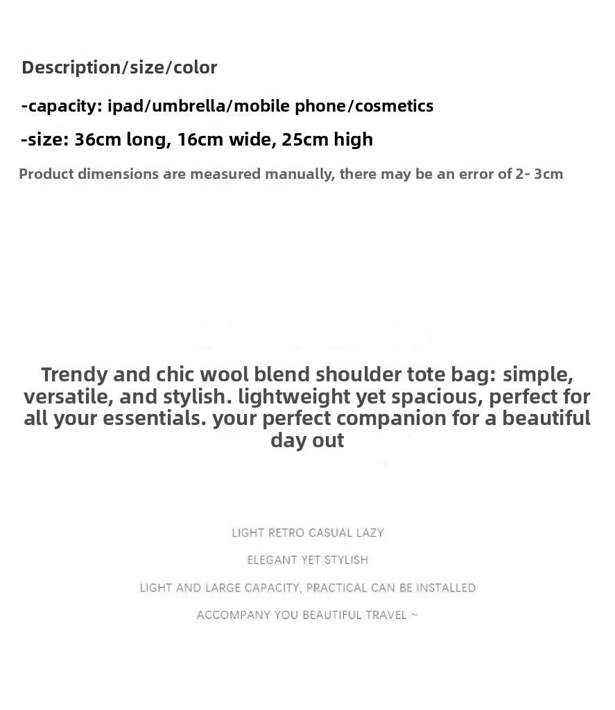 2025 Autumn Winter Wool Tote Bag for Women, Niche Fashion Large Capacity Handbag, Simple Shoulder Bag
