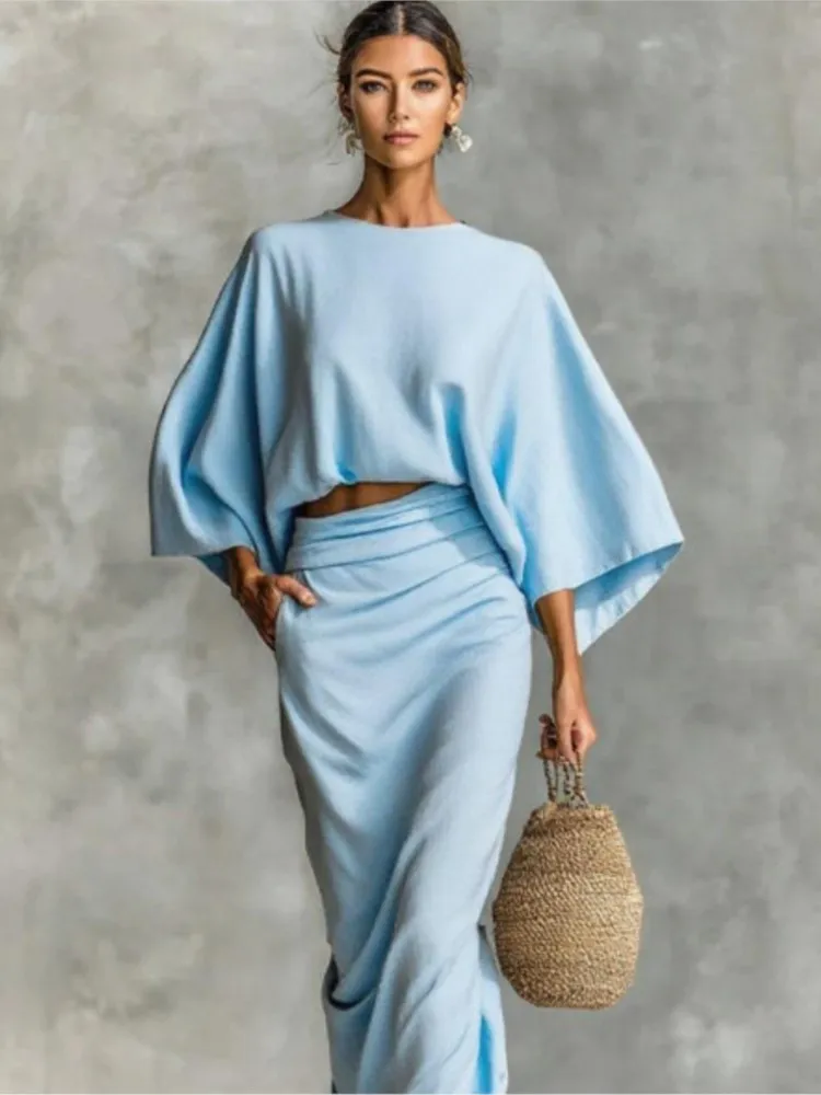 2025 New Fashion Bat Sleeve Shirt + Skirt Suit Women Autumn Casual Loose Solid Color Home Top Long Skirt For Women