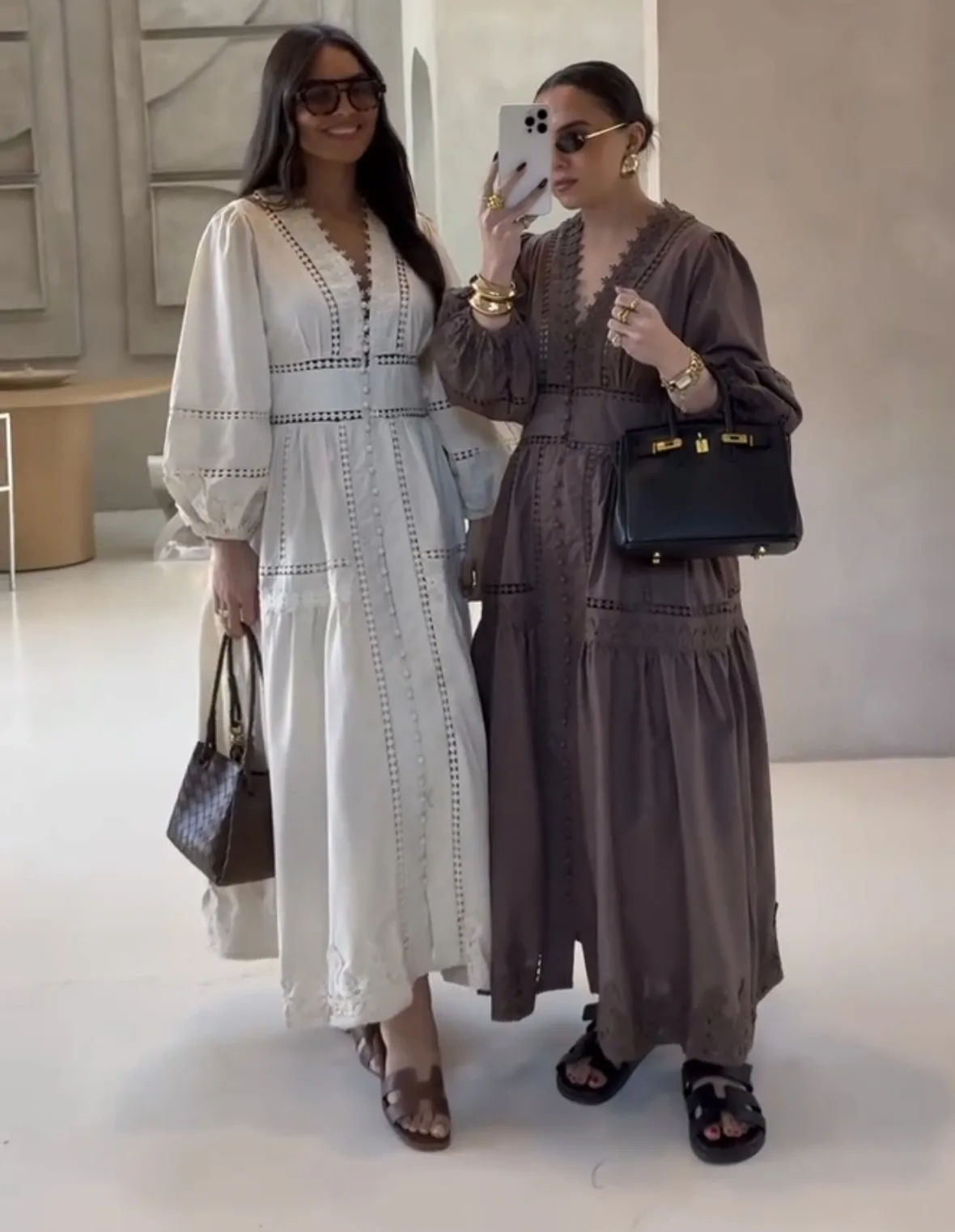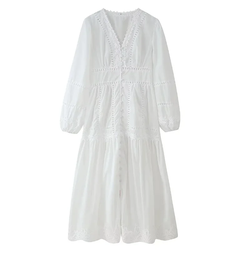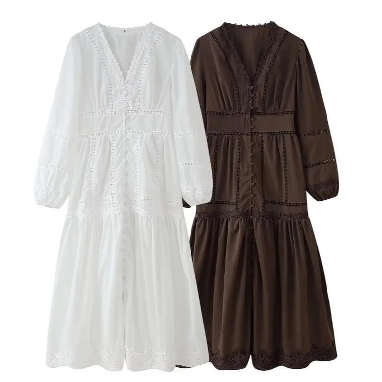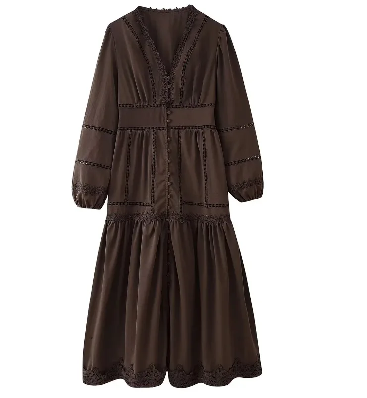 Elegant V Neck Lace Hollow Out Maxi Dress Women Puff Sleeve Embroidery Belt A-Line Elegant Spring New Lady Robes Summer 2025