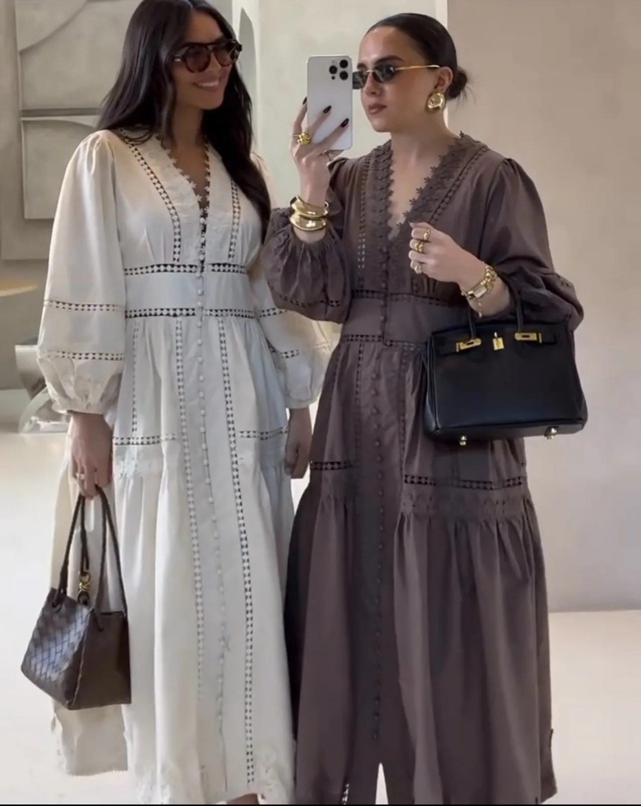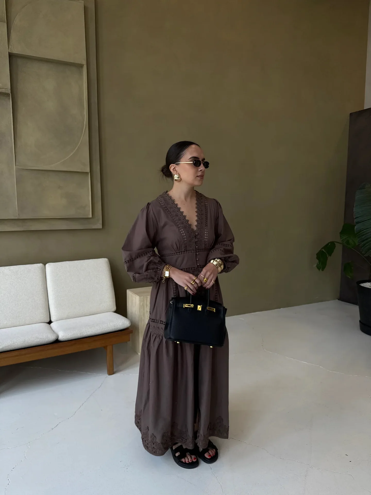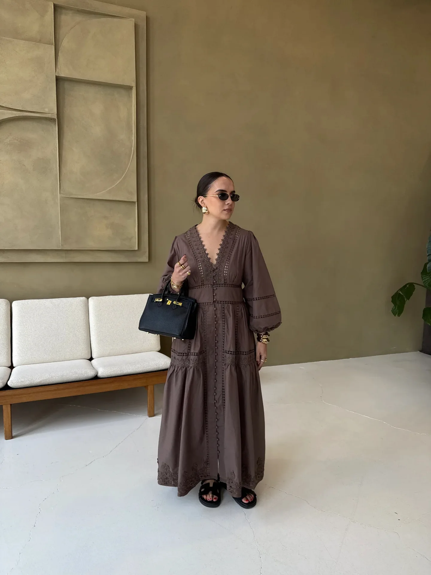 Elegant V Neck Lace Hollow Out Maxi Dress Women Puff Sleeve Embroidery Belt A-Line Elegant Spring New Lady Robes Summer 2025