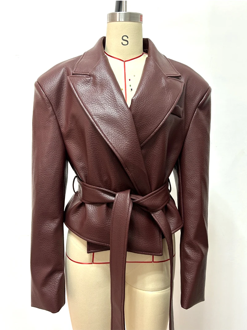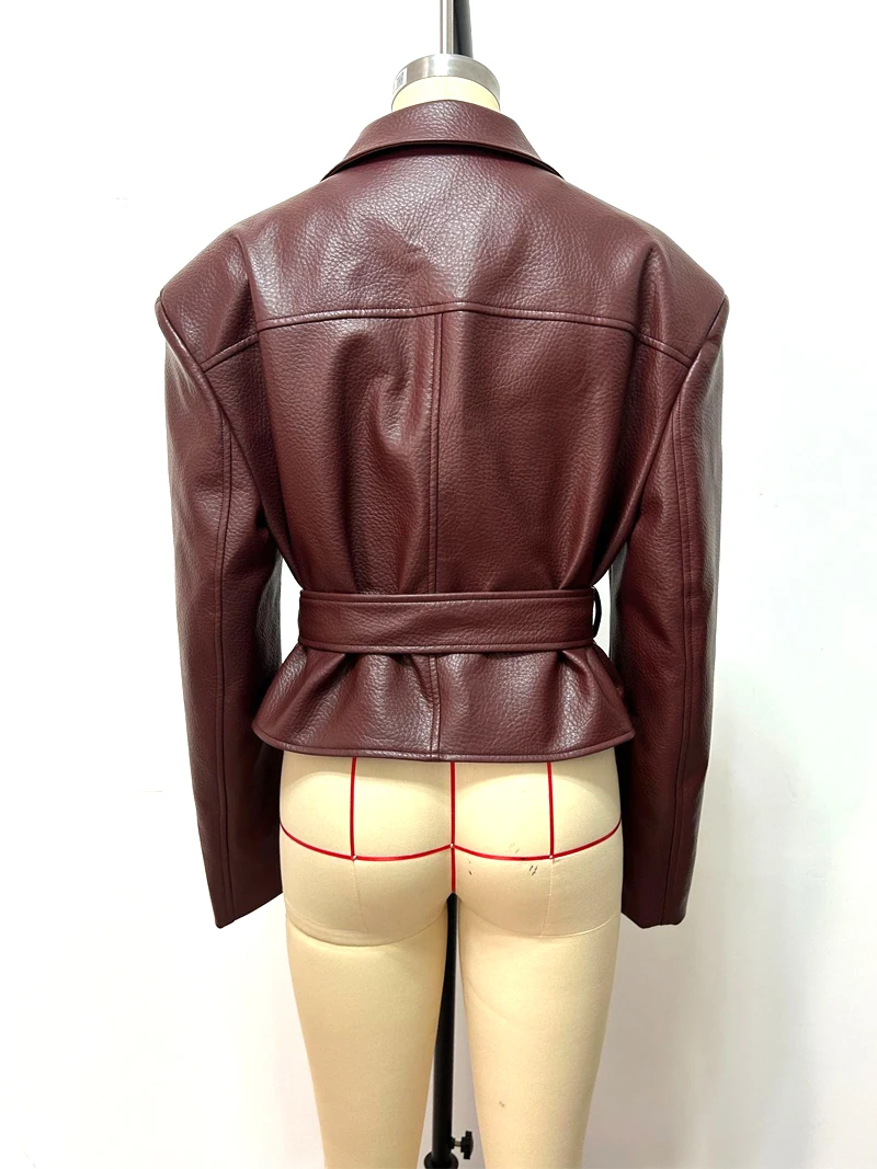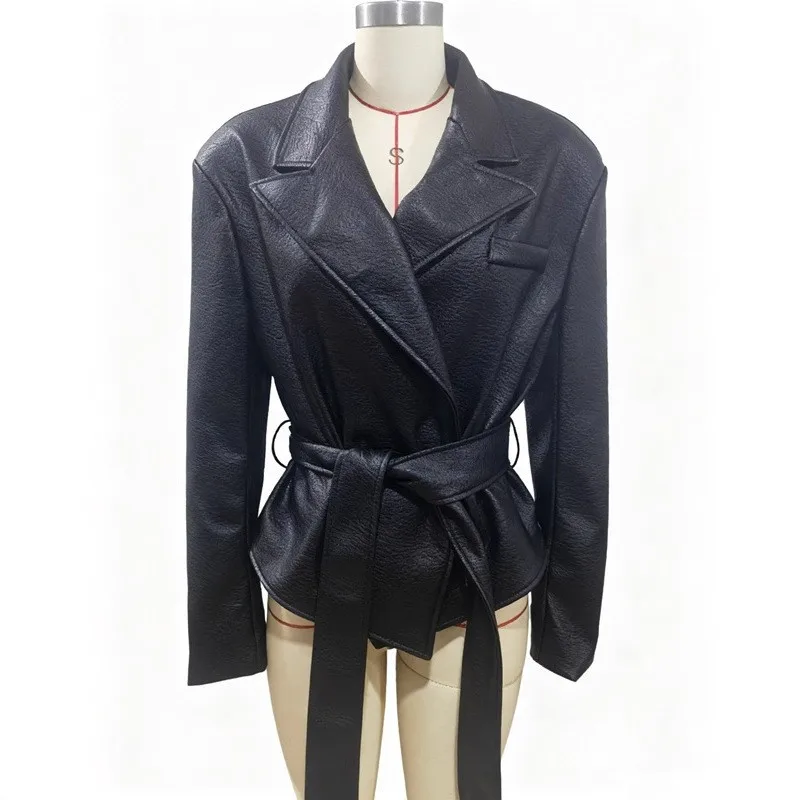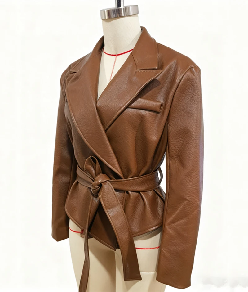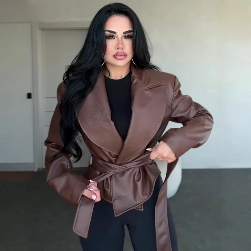 Motorcycle PU Leather Jacket Women 2026 Lace Up Turndown Collar Short Coat Jacket Full Sleeve Soft Leather Jacket New Outwear