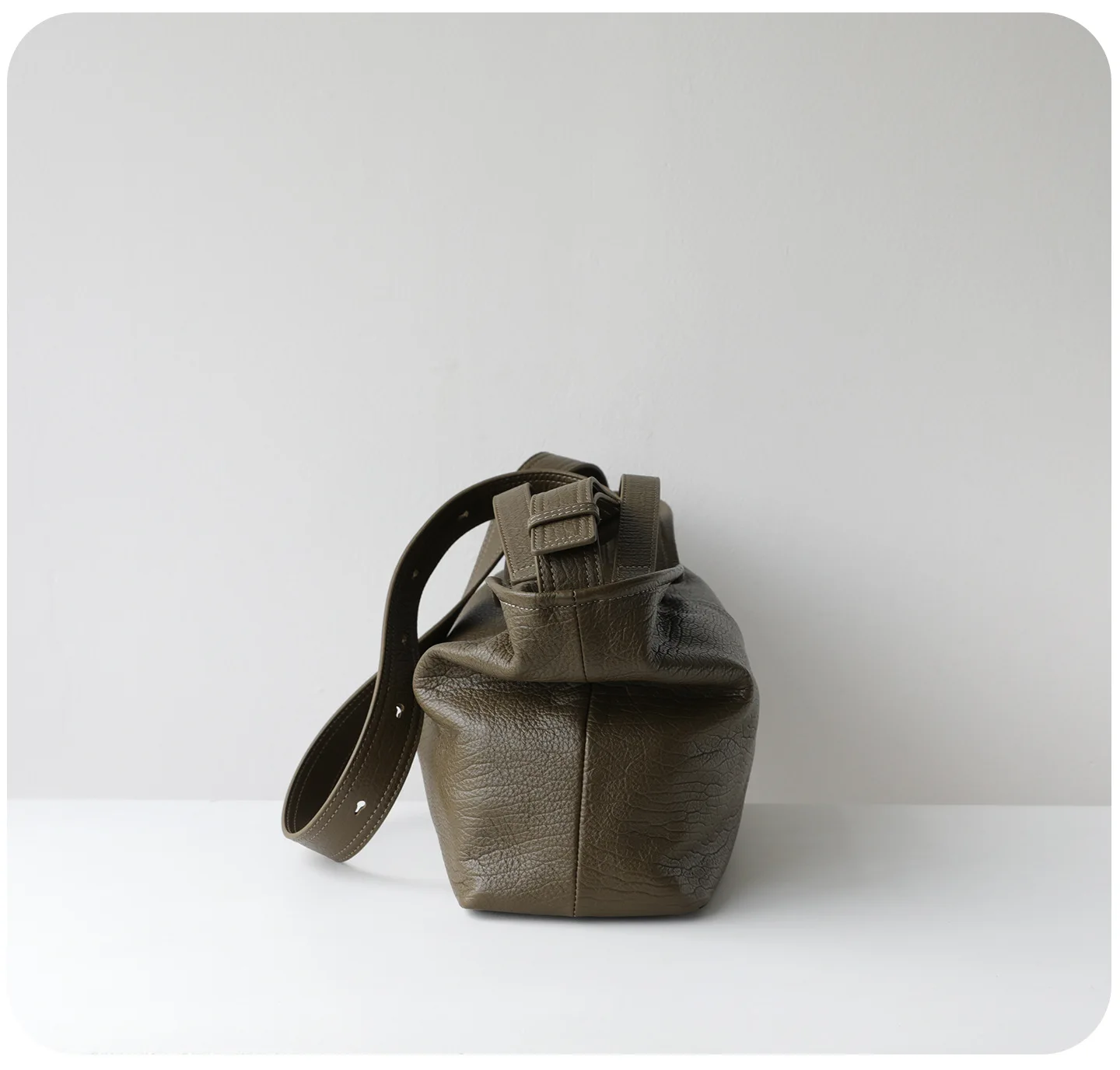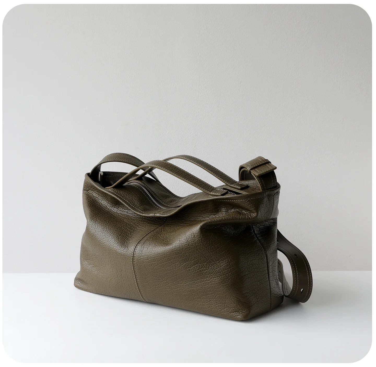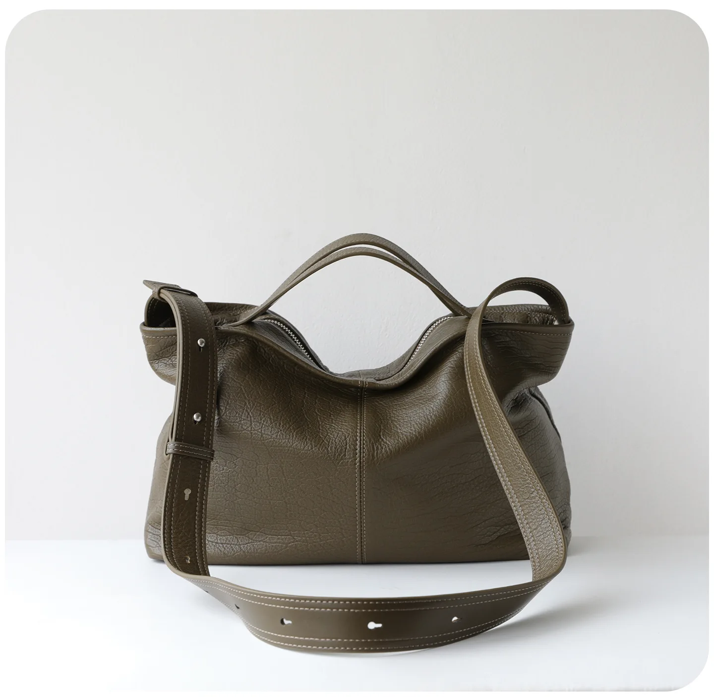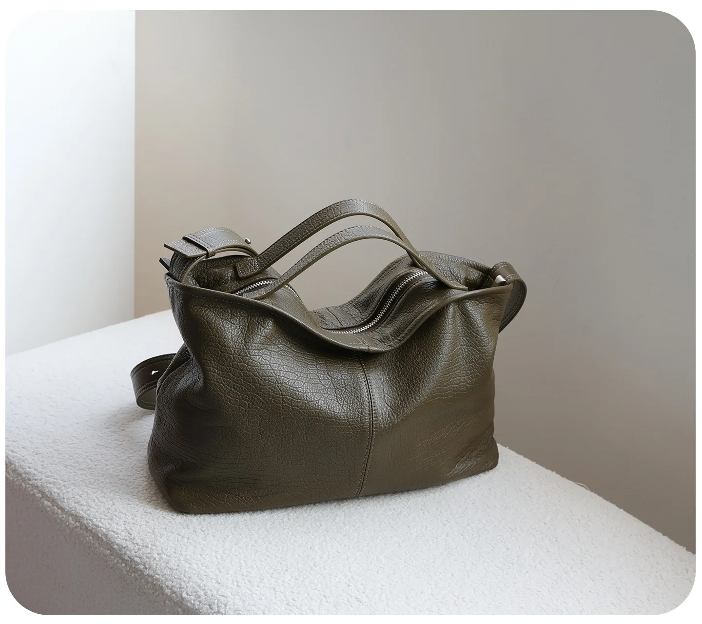 Slouchy Style Elephant Grain Top Layer Cowhide Leather Women Handbag Leisure Sage Green Beautiful Shoulders Bag