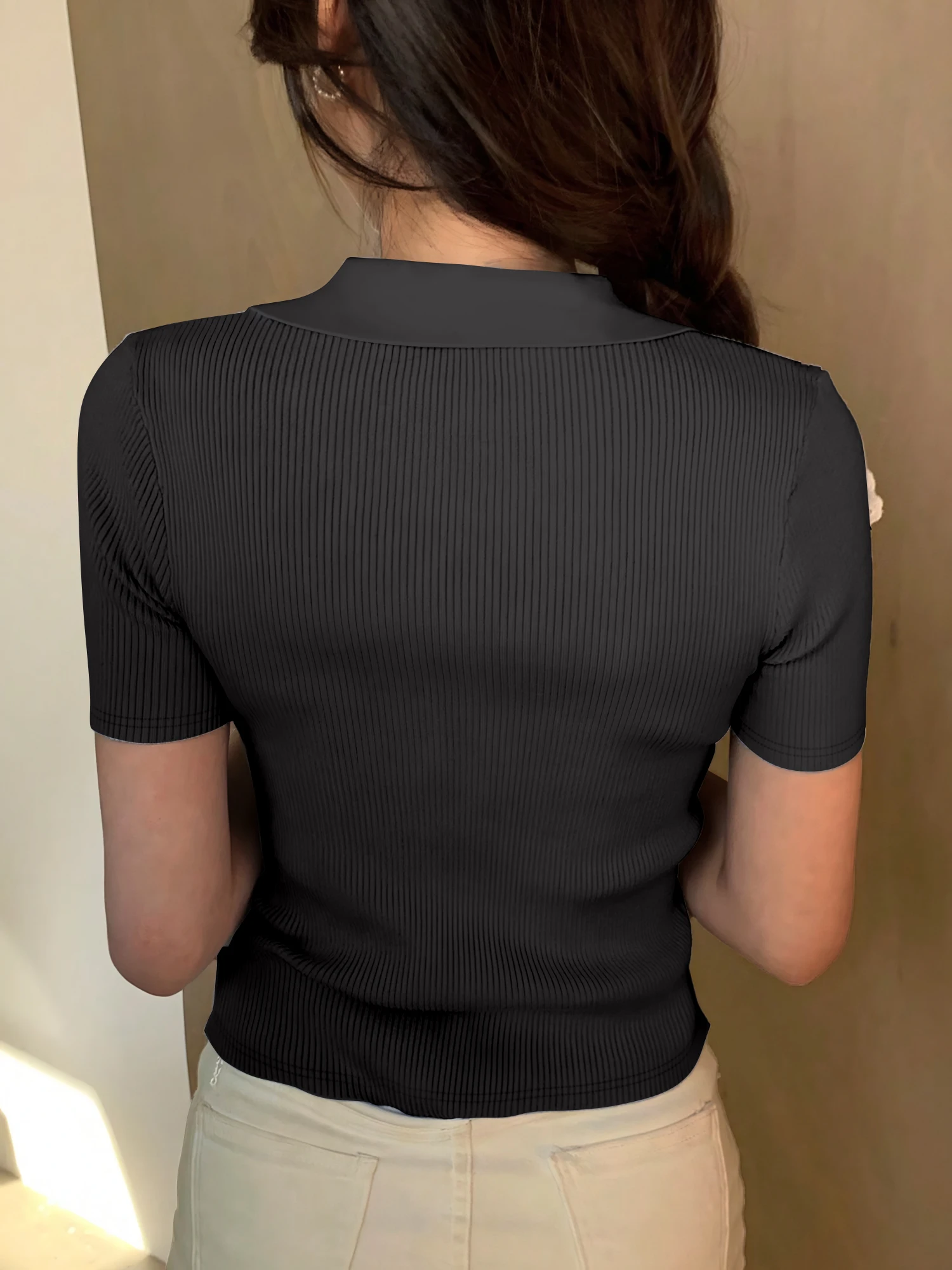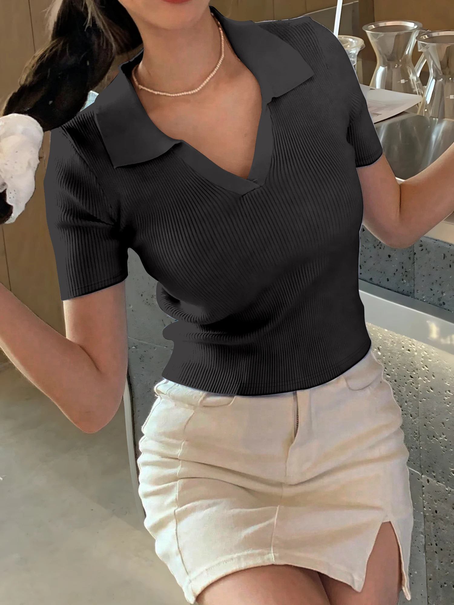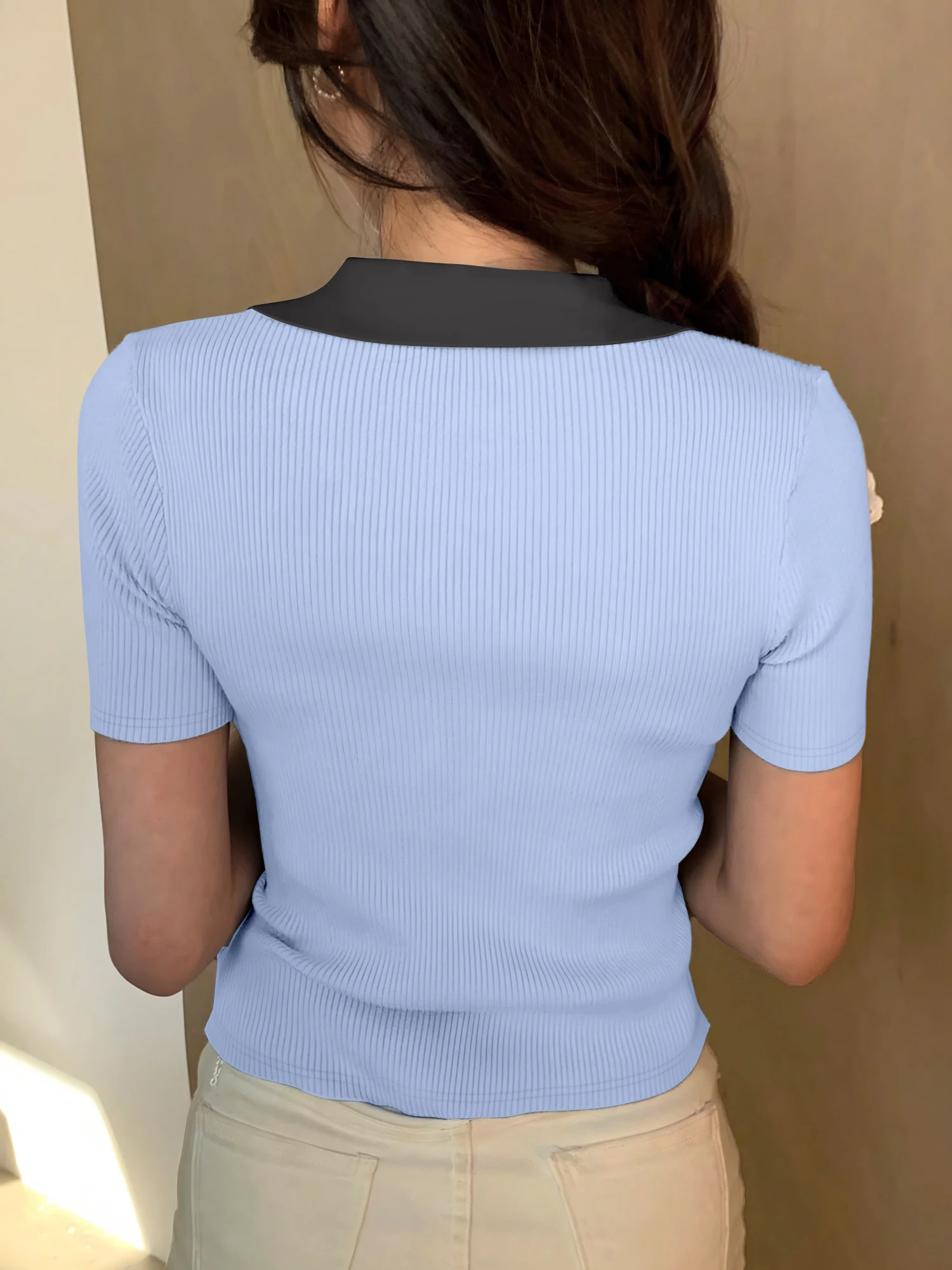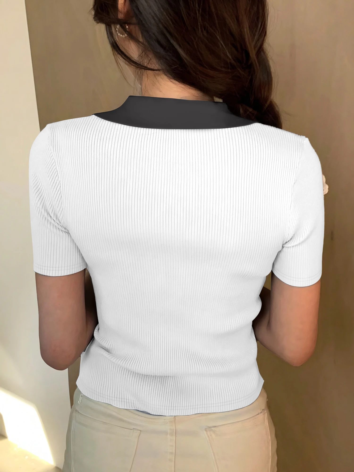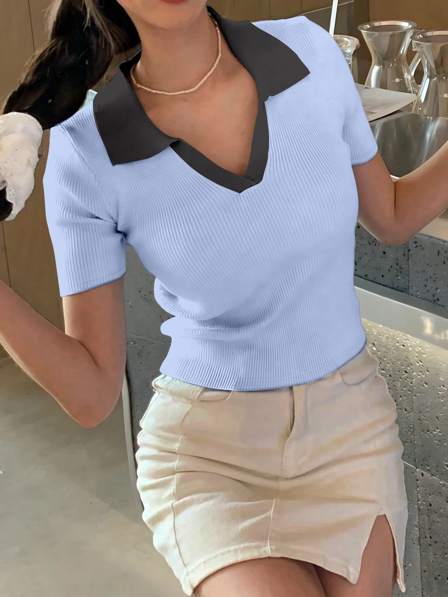 Summer Women's Shirt V-neck Short Sleeve POLO Shirt Clash Color Ribbed New Fashion Casual Women's Tops Sweet Style