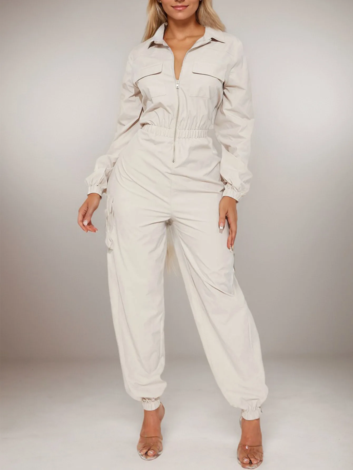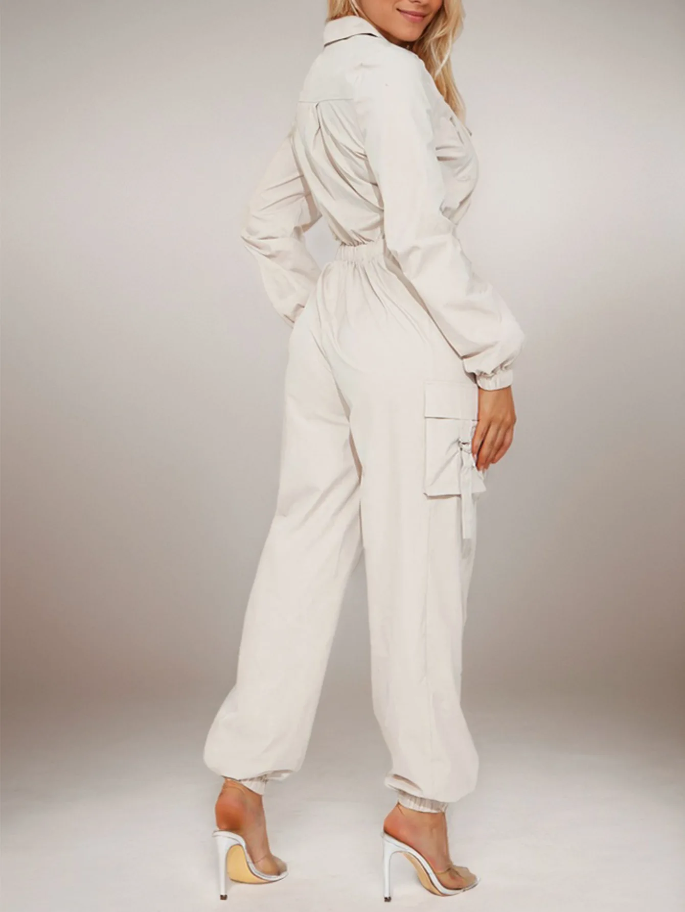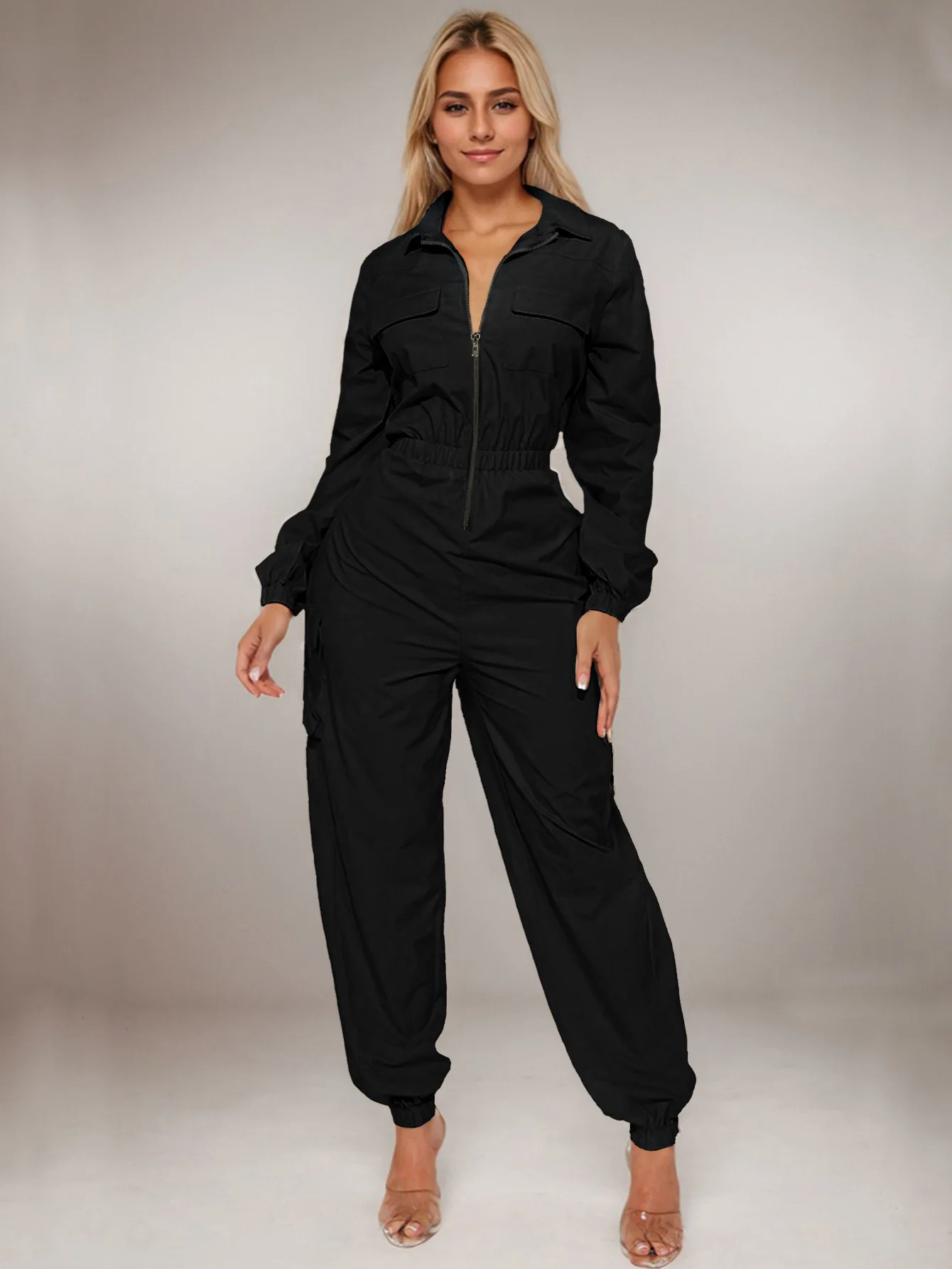 Women Jumpsuits Solid Rompers Zipper Pocket Turn Down Collar Long Sleeve Mid Waist Full Length Cargo Pants Loose Fit 2025 Summer