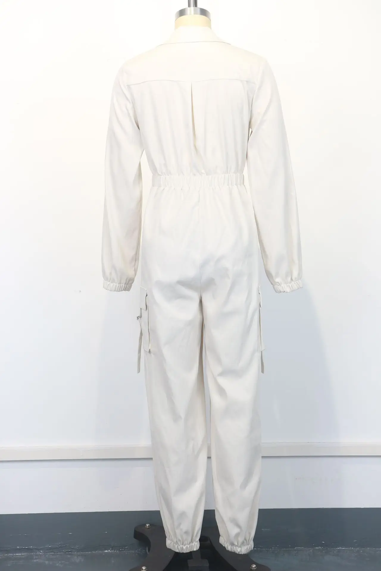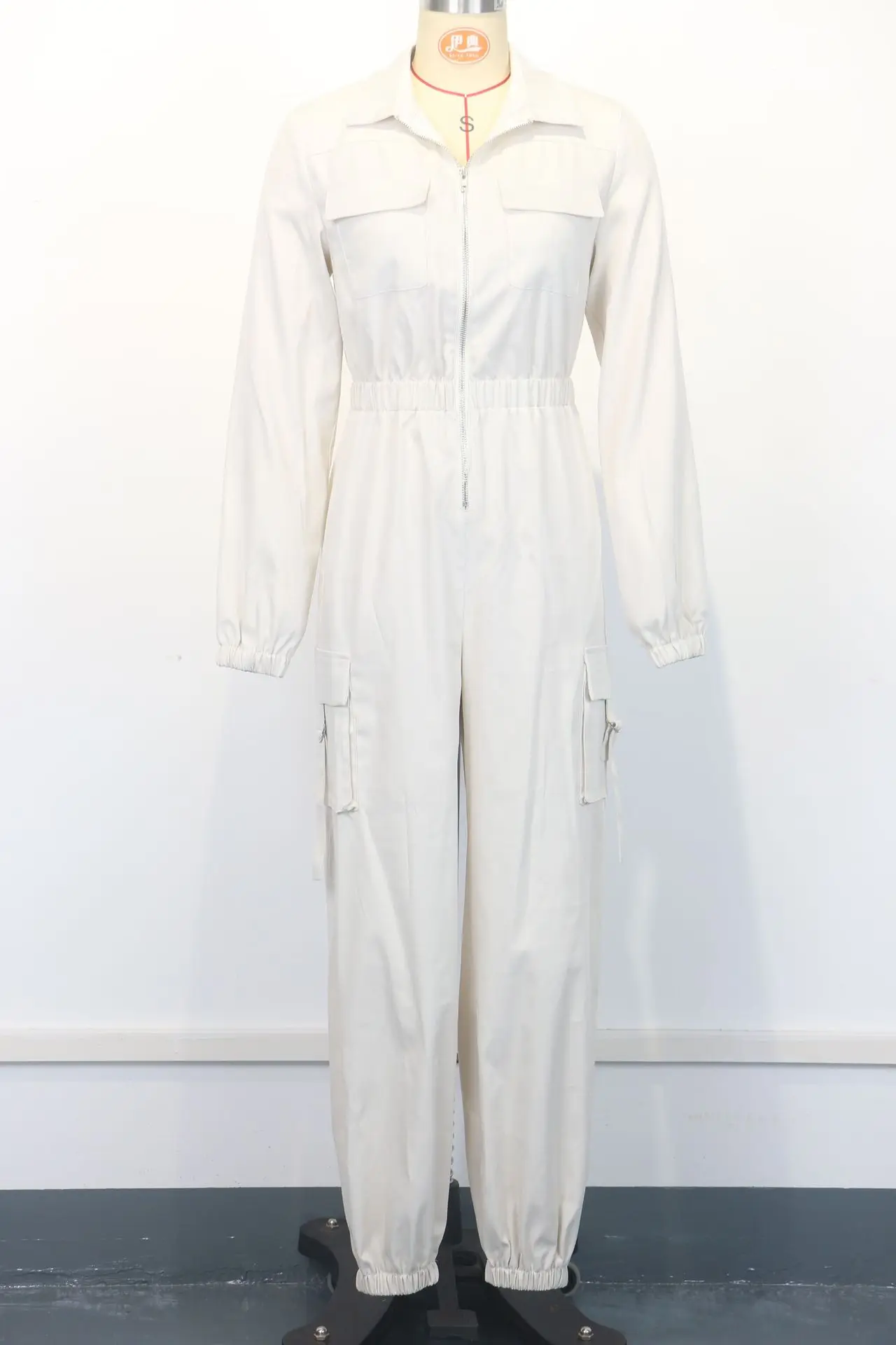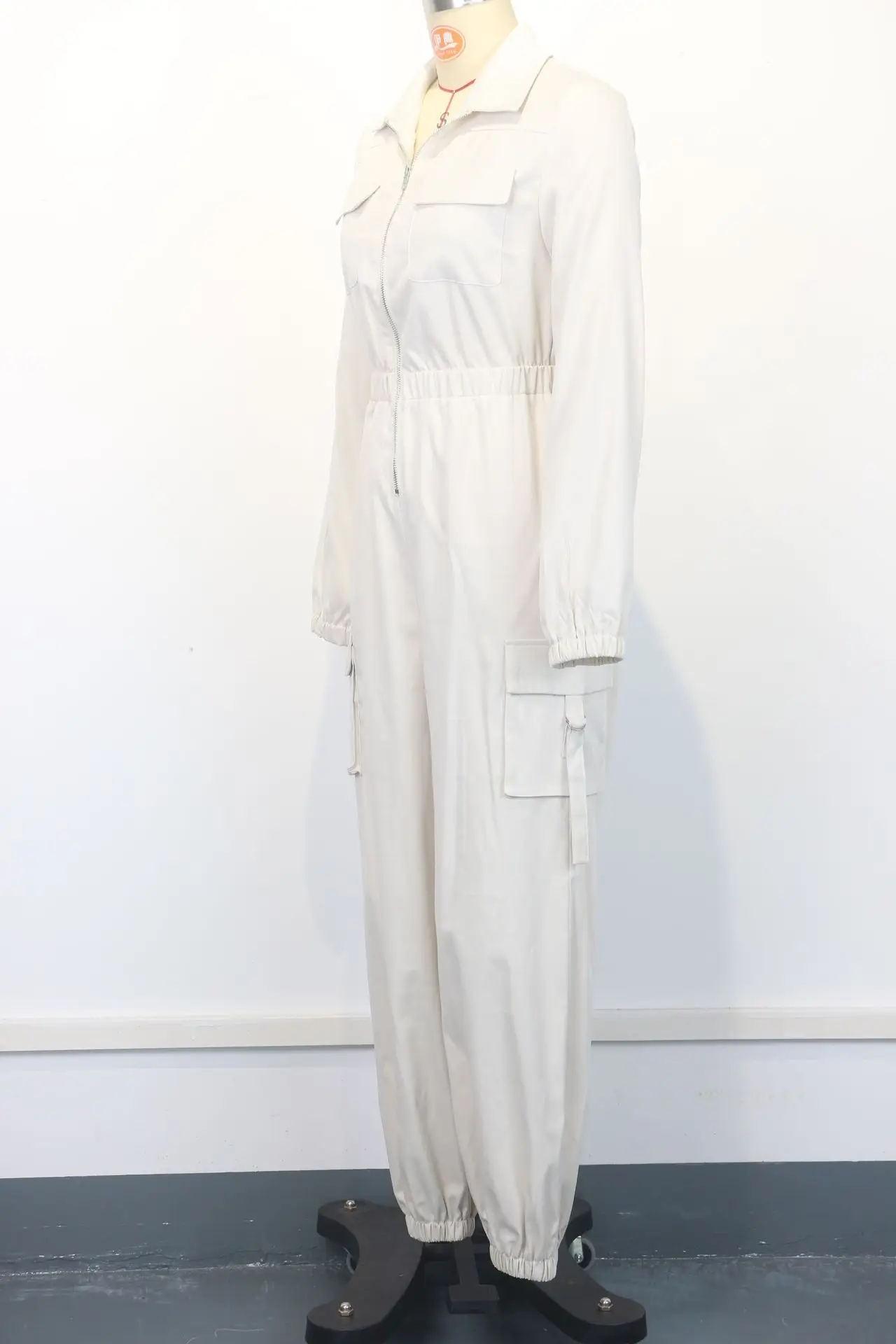 Women Jumpsuits Solid Rompers Zipper Pocket Turn Down Collar Long Sleeve Mid Waist Full Length Cargo Pants Loose Fit 2025 Summer